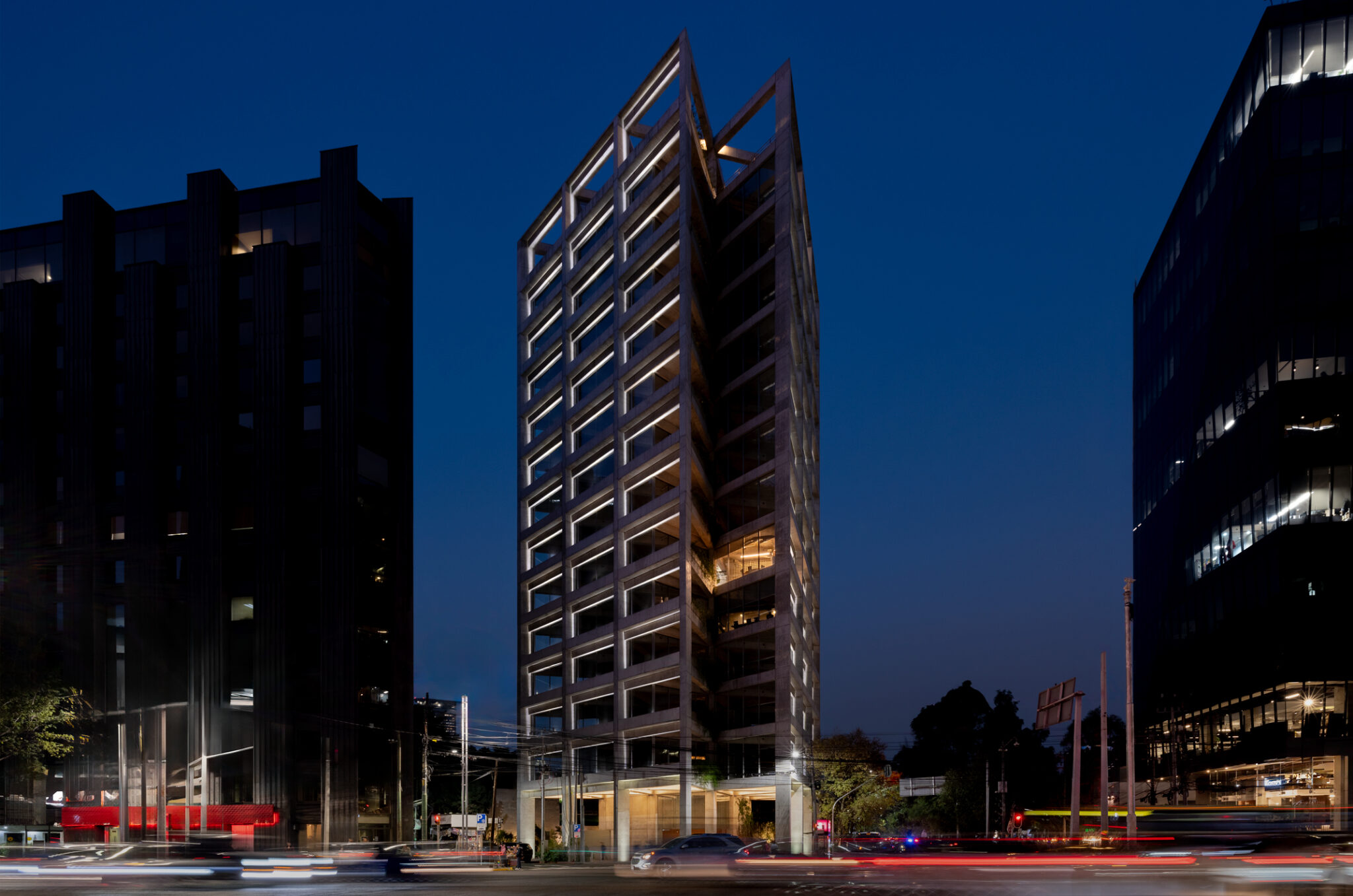 Torre Gutenberg es un edificio de uso mixto ubicado en la zona poniente de la Ciudad de México. El mayor reto fue realizar un esquema de iluminación para incrementar el valor de inversión inmobiliaria durante la pandemia del 2020. Se implementó un concepto de iluminación para la fachada y las zonas públicas que funcionara para los diferentes usos con los que cuenta el edificio, logrando que la torre se convierta en un hito de la zona.